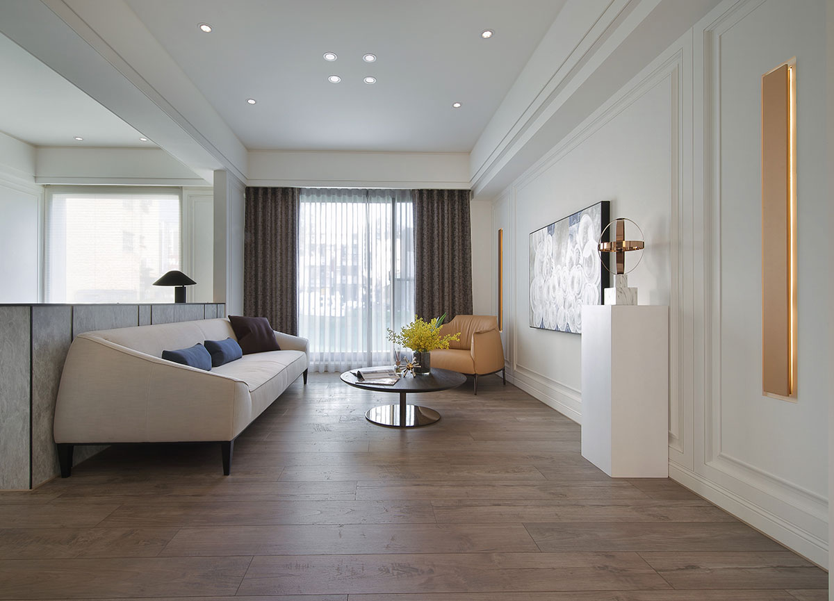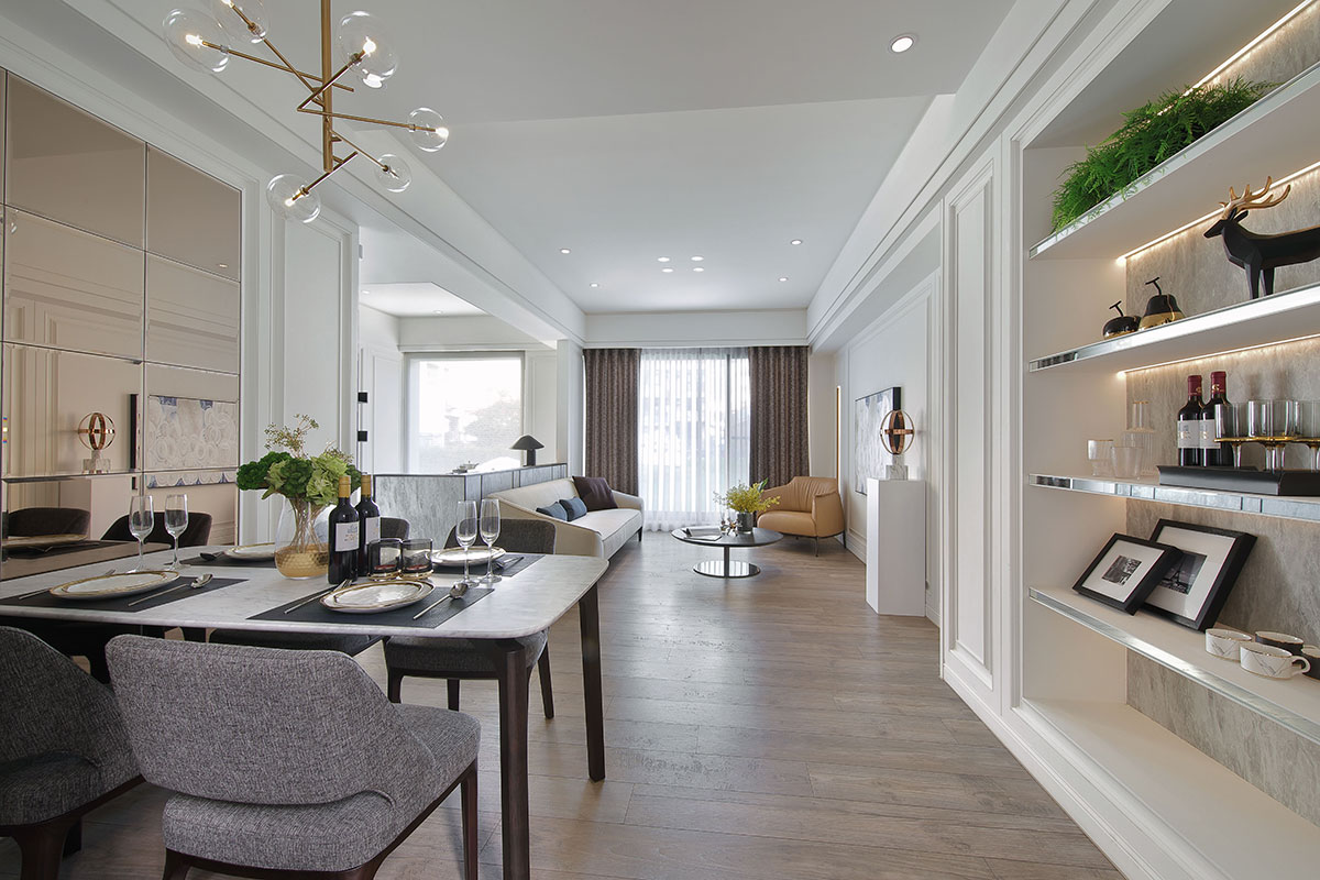 This residence seamlessly blends intricate moulding with warm, cosy lighting, elegantly highlighting walls and cabinets. The design exudes refined elegance while incorporating cherished memories from the residents’ time abroad. Golden metallic accents and bronze mirror surfaces enhance the female owner’s curated art collection, infusing the space with a stylish, romantic modern flair.