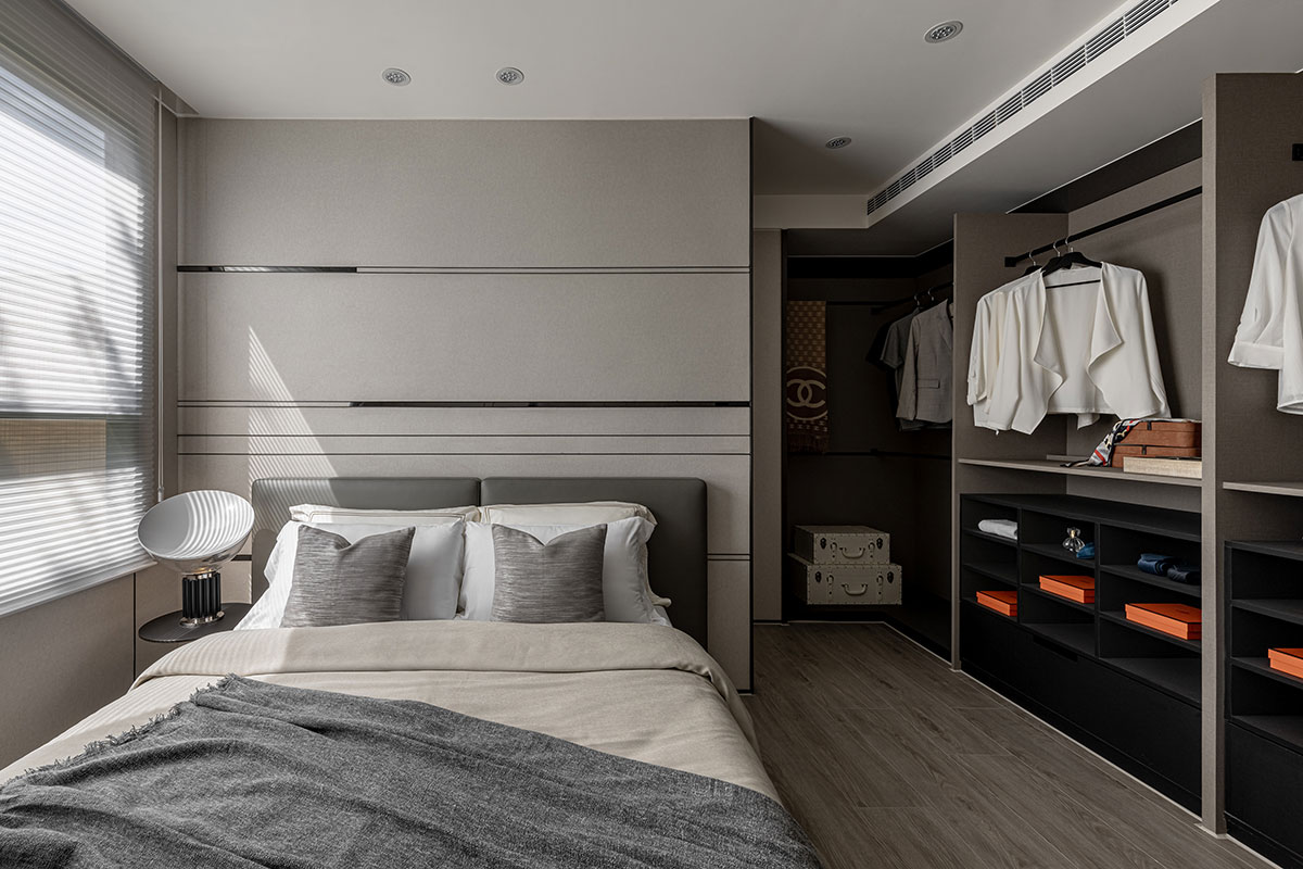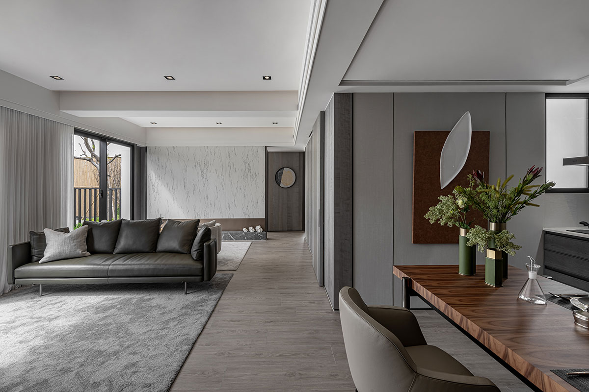 This design artfully balances contrasting preferences to contemplate the refined lifestyle of a couple of financial executives. The male owner values a serene, understated space ideal for hosting guests; the female owner treasures a bright, welcoming ambiance for intimate afternoon gatherings and expresses her passion for cultivating flora. The layout incorporates two distinct living rooms to accommodate these dual desires, each meticulously crafted to reflect their unique tastes, creating harmonious sanctuaries of sophistication. The design journey encountered challenges presented by structural beams that fragmented the spatial flow. These obstacles were skillfully addressed through a layered ceiling design that not only resolves the architectural constraints but also enhances the overall visual rhythm. By eschewing excessive partitions, the plan fosters an open and fluid connection between the living and dining areas, cultivating an atmosphere of spatial continuity and balance. Further elevating the design, the expansive balcony was thoughtfully reimagined to honor the female owner’s love for gardening. This outdoor extension introduces lush greenery into the interior, blurring the boundaries between indoor and outdoor spaces. The result is a tranquil and invigorated narrative, where natural elements imbue the home with vitality and serene elegance.