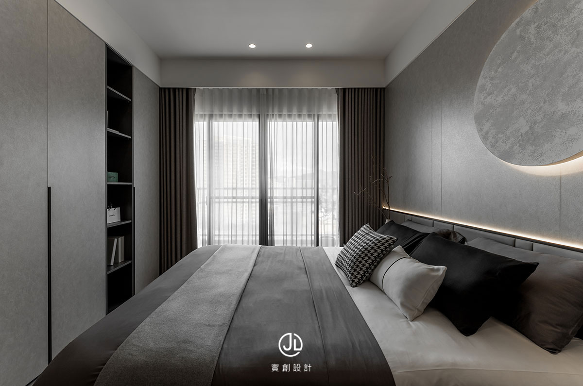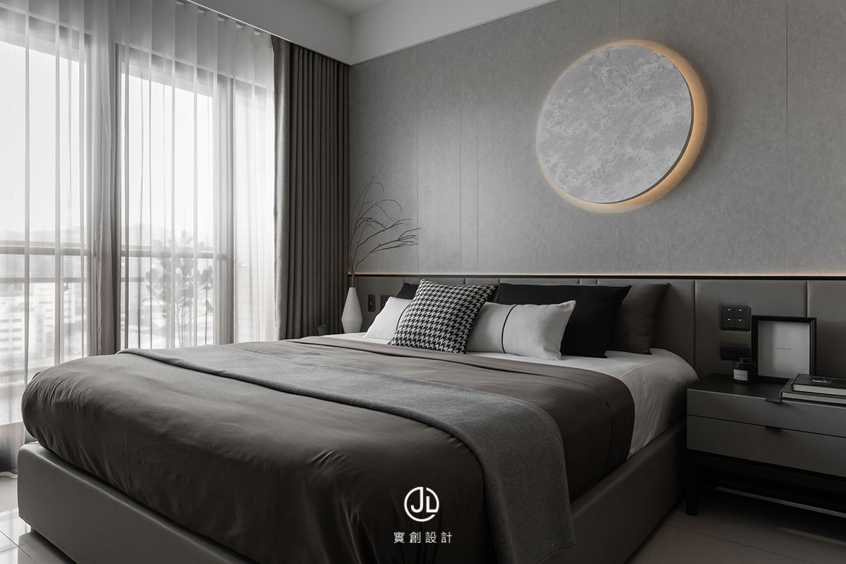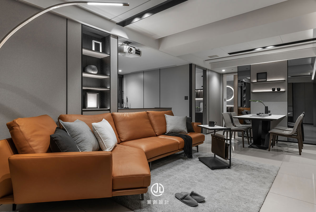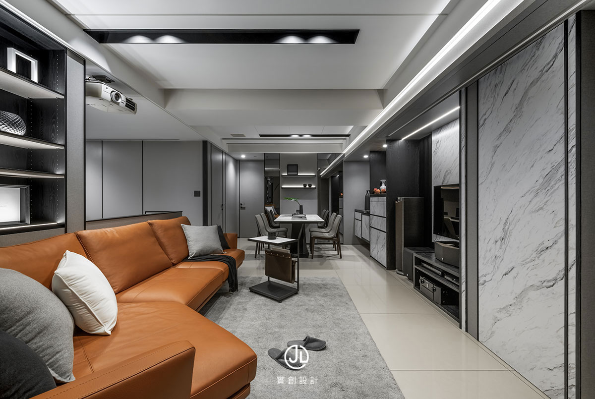 灰白相間,如暮夜雲層,襯映出月光壁飾;石材紋理,橘色軟裝,相偕間接燈源,調配筆墨濃淡,構築一幅水墨畫卷——風揚月至,雲潤星暉,空間如畫。透過現代筆觸,點染古風色料,隨類賦彩層層渲染,為屋主一家勾勒軒朗屋宇。