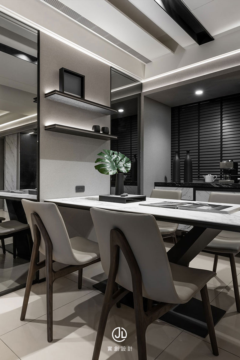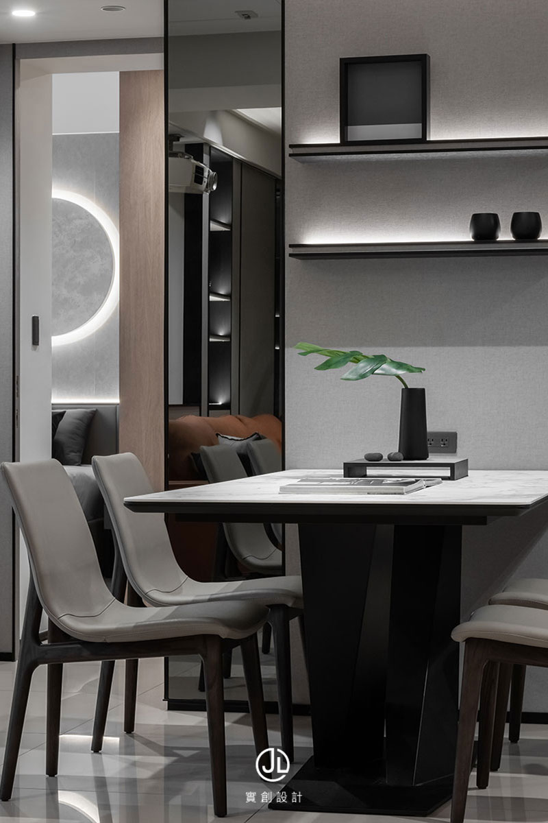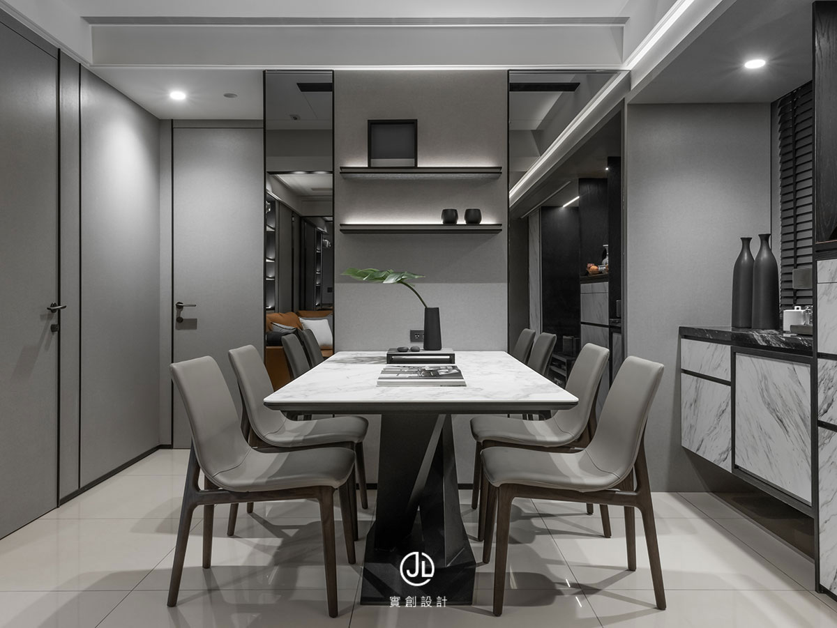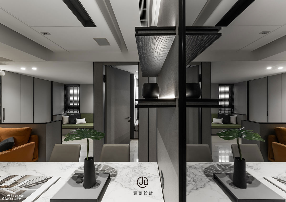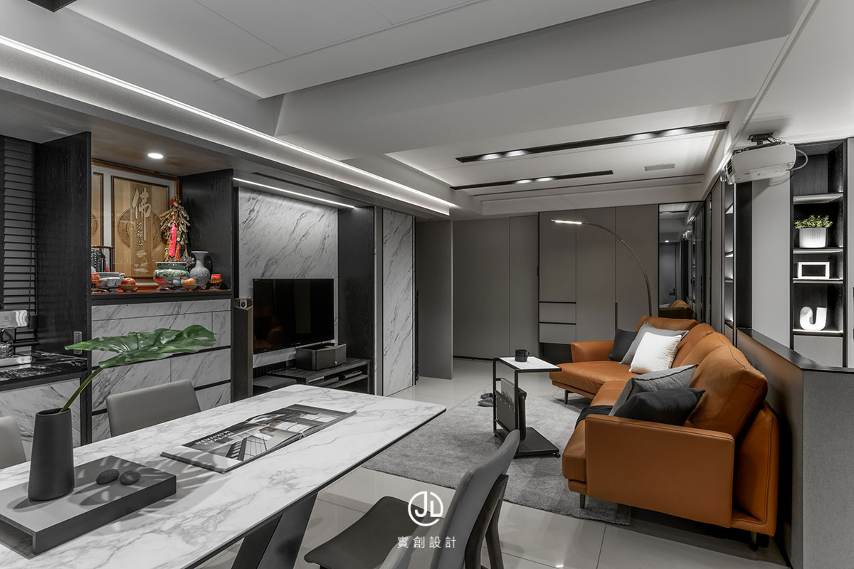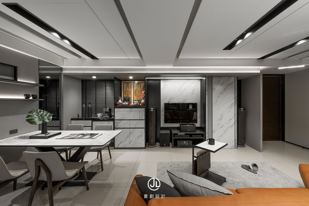 熱愛毛孩的屋主一家,養了4隻狗狗,為了讓他們能在家中自由活動,且維護環境,特別選用耐磨材料,亦方便清潔保養。並因應風水需求及實際考量,將客、餐廳空間重新配置,透過開放式動線,使視野及採光具通透性,虛實相融串連場域。